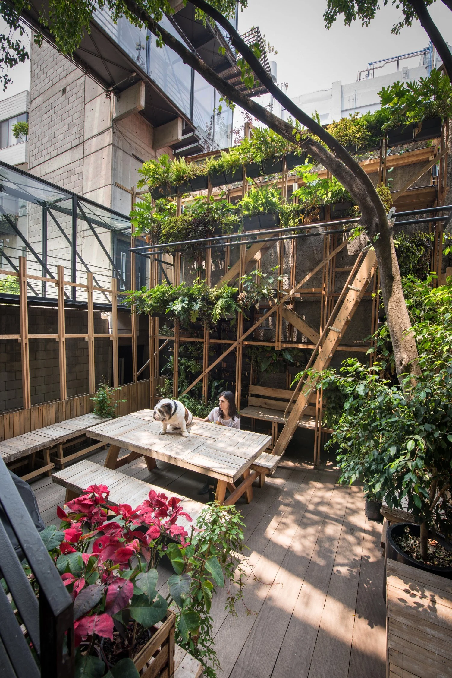 Se agregó una estructura continua de madera maciza a un espacio existente de 450 m2 para aumentar su eficiencia y potencial. La estructura, ensamblada a la manera de un andamio, forma un entrepiso dentro del departamento que se convierte en escalera, biblioteca y finalmente un jardín vertical en el patio. Este ambicioso proyecto logra unir el exterior con el interior así como un nivel a otro y ha sido ampliamente reconocido en la prensa y en las ceremonias de premiación en México.